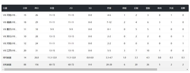 张子宇这六场比赛,场均仅登场14分钟,拿到26分4.3篮板0.8助攻0.3抢断0.8盖帽,命中率94.44%。
